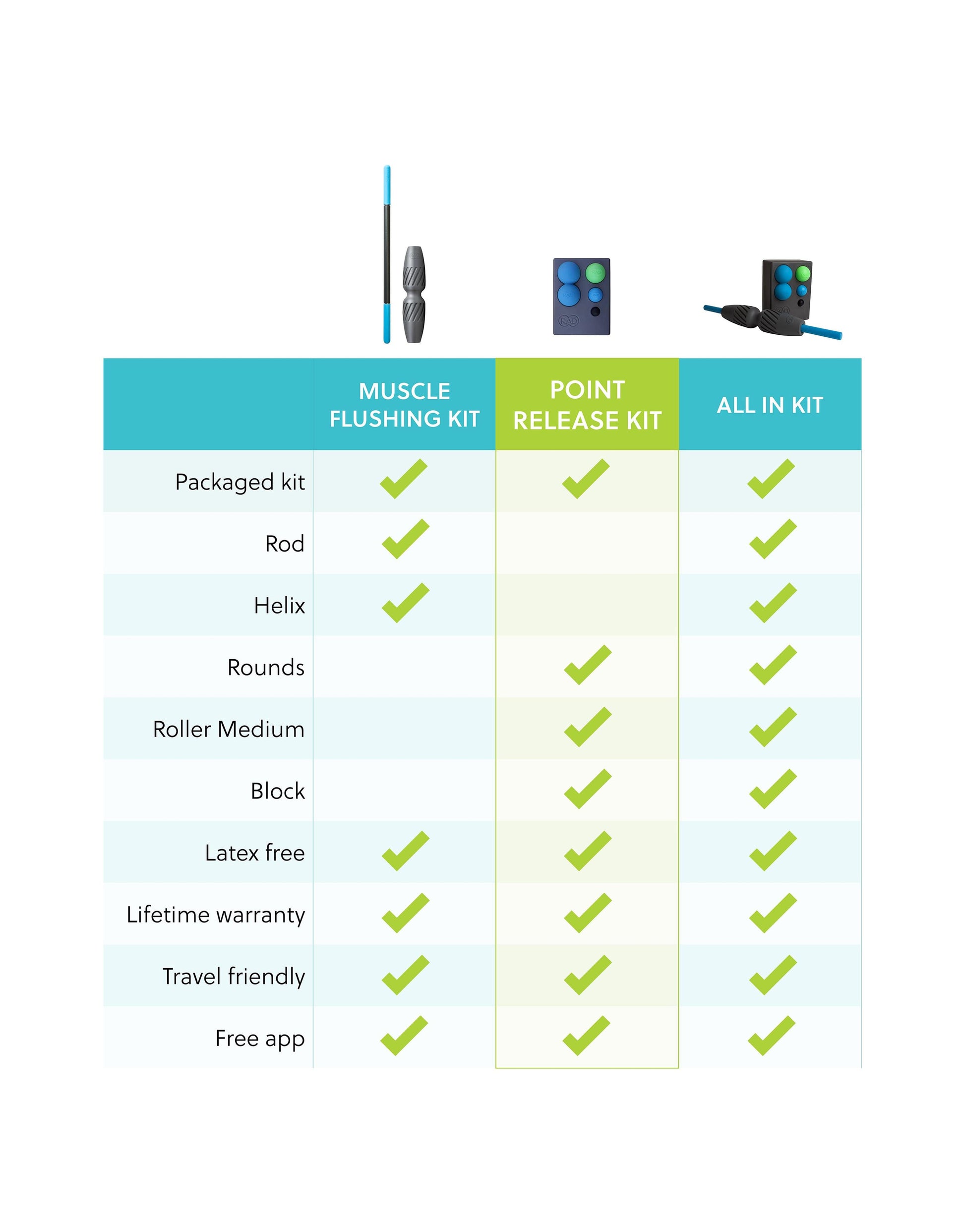 The Point Release Kit elevates your Roller and Rounds via the Block for better leverage in hard-to-reach places. The Block also stabilizes your RAD SMR tools in its specially designed recesses so you can isolate and apply the desired pressure to just the right spot! This set of tools is also very compact and portable. The Block offers storage for one of your Rollers and a full set of Rounds in between RAD sessions. Easy to carry, easy to clean, easy to travel with!